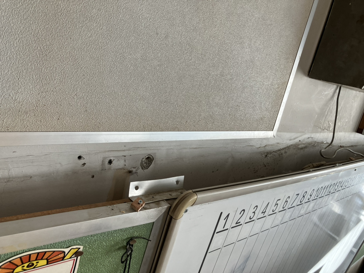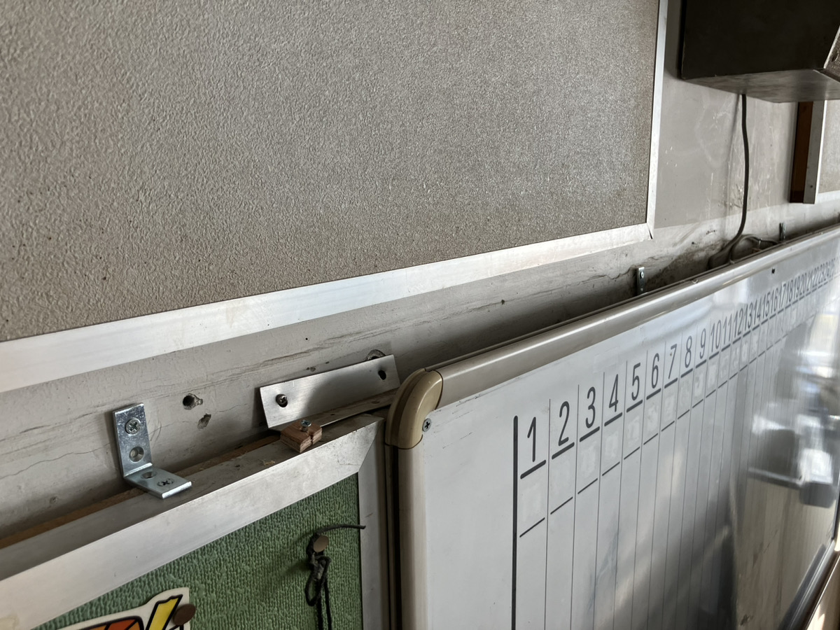 軽い物とはいえ、数があると重くなってしまい黒板付近が少し外れしまい、修繕として直すことになりました。